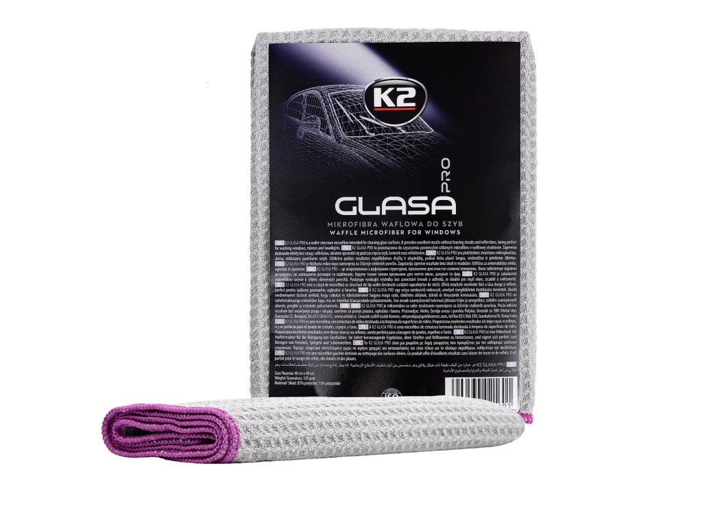 - K2 GLASA PRO je vysoko kvalitné mikrovlákno s vaflovou štruktúrou, vytvorené špeciálne na čistenie sklenených povrchov. Jeho jedinečná štruktúra zaručuje vynikajúce výsledky bez šmúh a odleskov, vďaka čomu je ideálne na čistenie okien, zrkadiel a svetlometov.